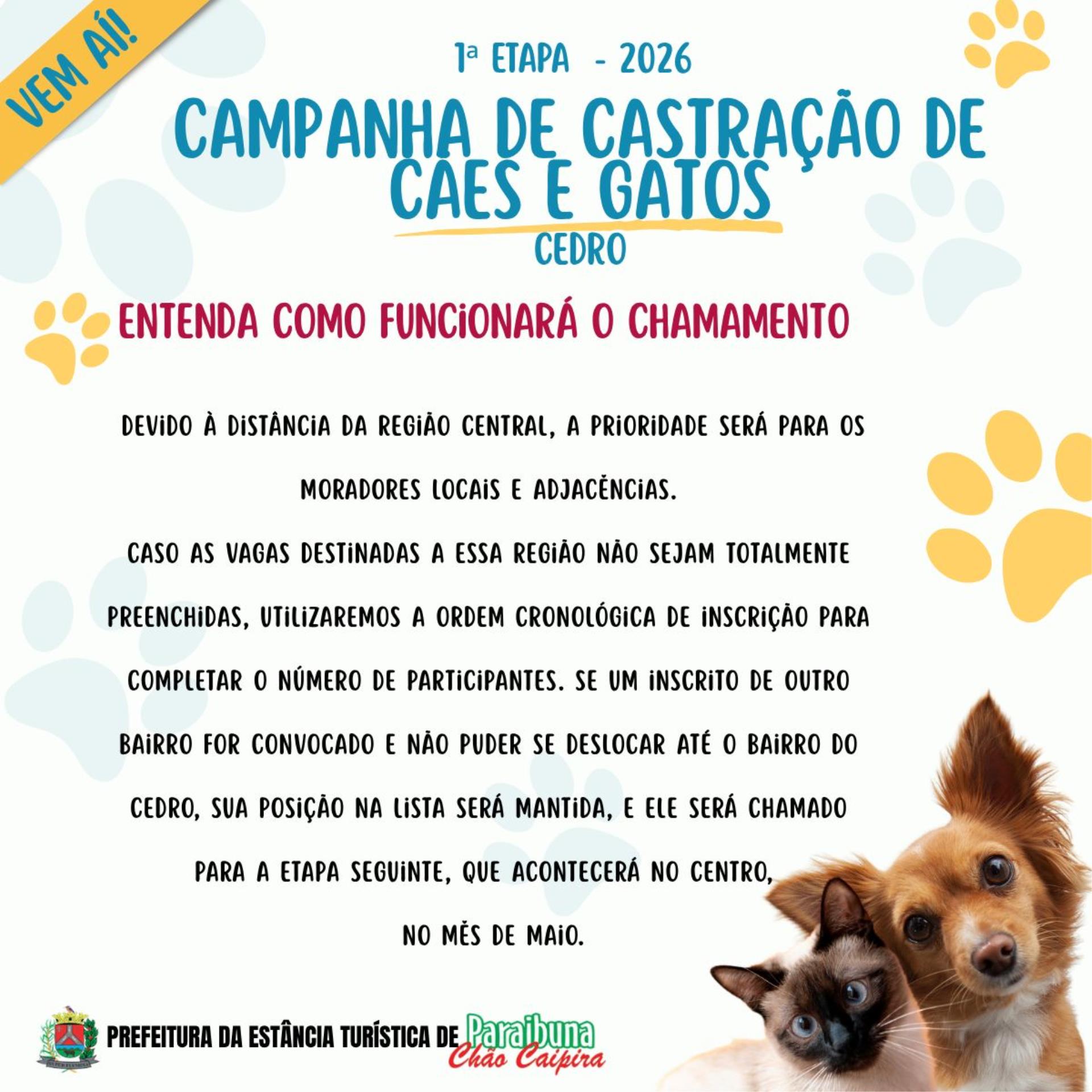 A Prefeitura informa que a primeira etapa do programa de castração animal de 2026 será realizada pela Divisão de Zoonoses, no dia 26 de abril (domingo) no bairro do Cedro.
