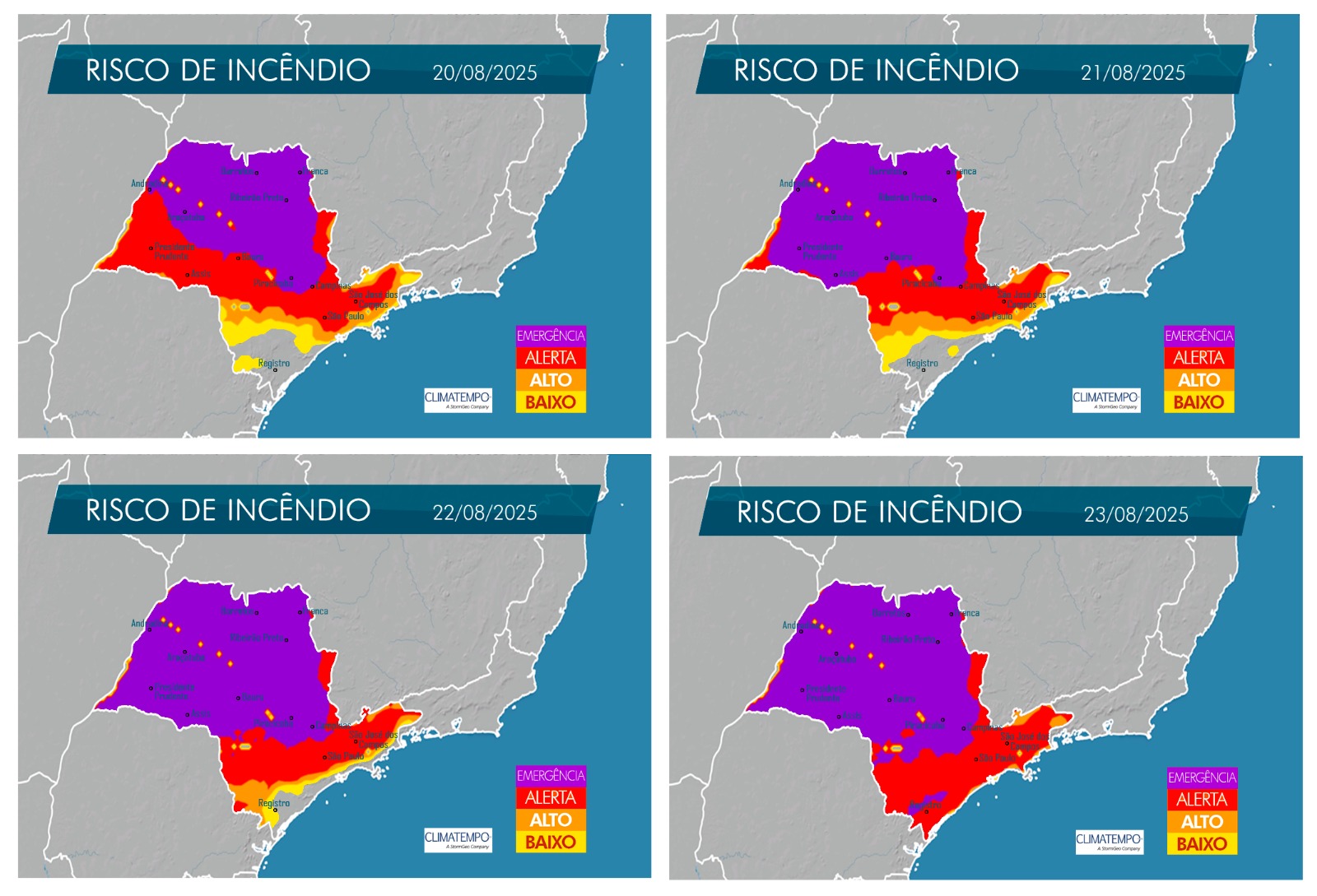 Já a partir desta quarta-feira (20), o clima muda: teremos um veranico, com temperaturas acima da média e baixa umidade do ar, o que aumenta o risco de queimadas.