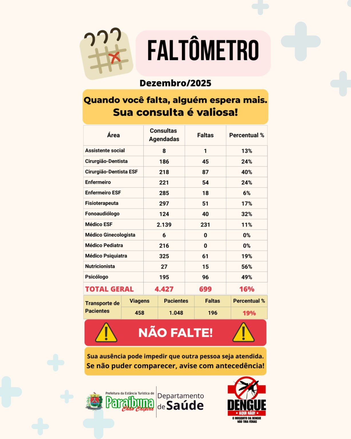 A Prefeitura de Paraibuna, por meio do Departamento de Saúde, divulgou os dados do Faltômetro de dezembro de 2025. No mês, foram 4.427 consultas agendadas, com 699 faltas, o que representa 16% de ausência na rede municipal de saúde.