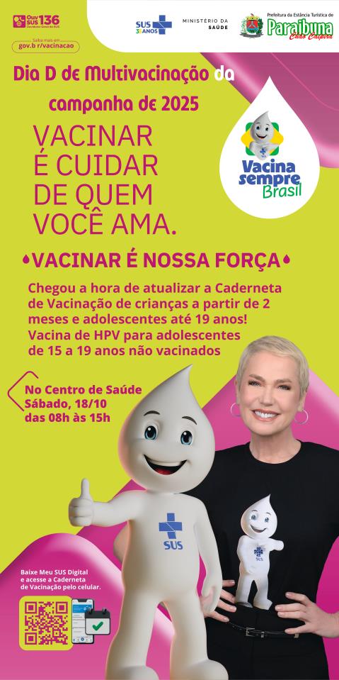A Prefeitura da Estância Turística de Paraibuna, por meio do Departamento Municipal de Saúde, realiza, neste sábado (18), o “Dia D” da Campanha de Multivacinação 2025, das 8h às 15h, no Centro de Saúde da cidade.