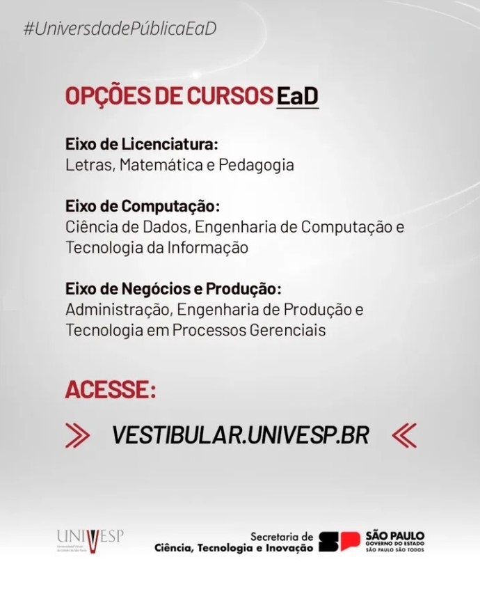 A Universidade Virtual do Estado de São Paulo – Univesp, vinculada à Secretaria de Ciência, Tecnologia e Inovação (SCTI), abre nesta quinta-feira (06), às 10h, as inscrições para o Vestibular 2025, destinadas a 432 polos, de 373 municípios (capital, interior e litoral), nos cursos gratuitos de Letras, Matemática e Pedagogia (Eixo de Licenciatura); Ciência de Dados, Engenharia de Computação e Tecnologia da Informação (Eixo de Computação); e Administração, Engenharia de Produção e Tecnologia em Processos Gerenciais (Eixo de Negócios e Produção).