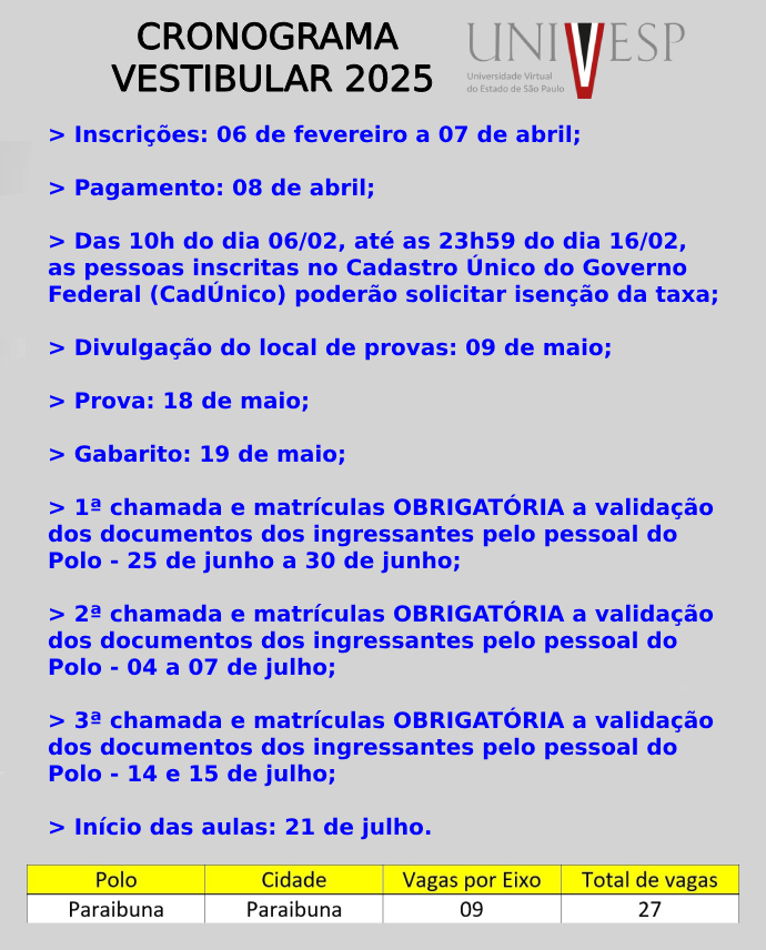 As inscrições terminam no dia 07 de abril, às 23h59, e devem ser feitas pelo site: vestibular.univesp.br. A prova (objetiva e redação) ocorrerá em 18/05, às 13h, e os locais oficiais serão divulgados no dia 09/05, a partir das 10h. O início das aulas está previsto para o final de julho de 2025.